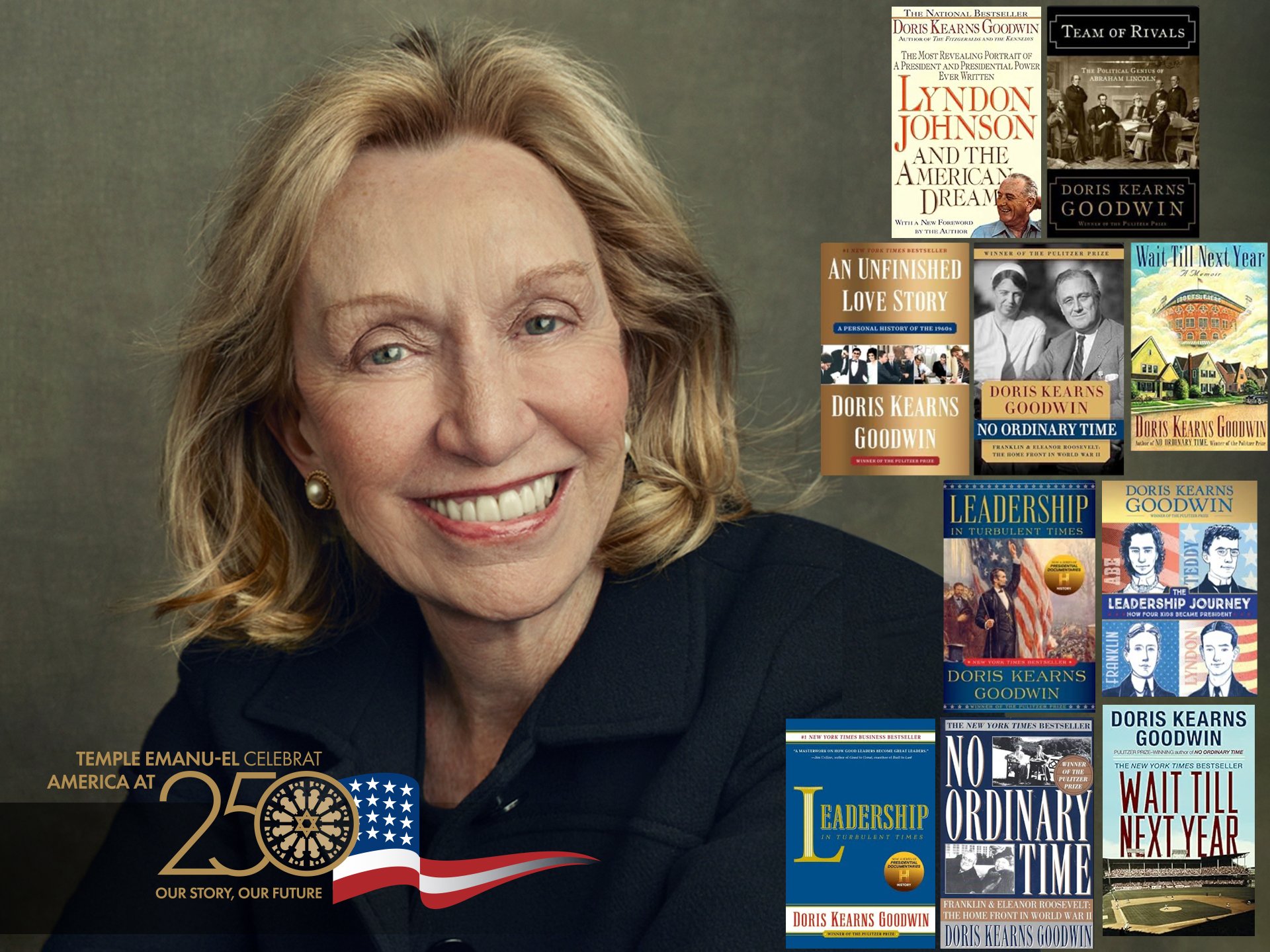 The Temple Emanu-El Streicker Cultural Center is proud to invite you to an evening of history, stories and wine with renowned historian Dr. Doris Kearns Goodwin, inaugurating our year-long Semiquincentennial celebration.